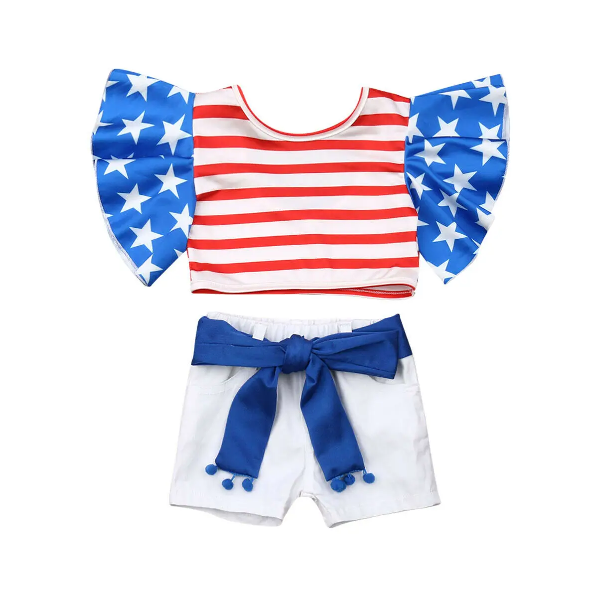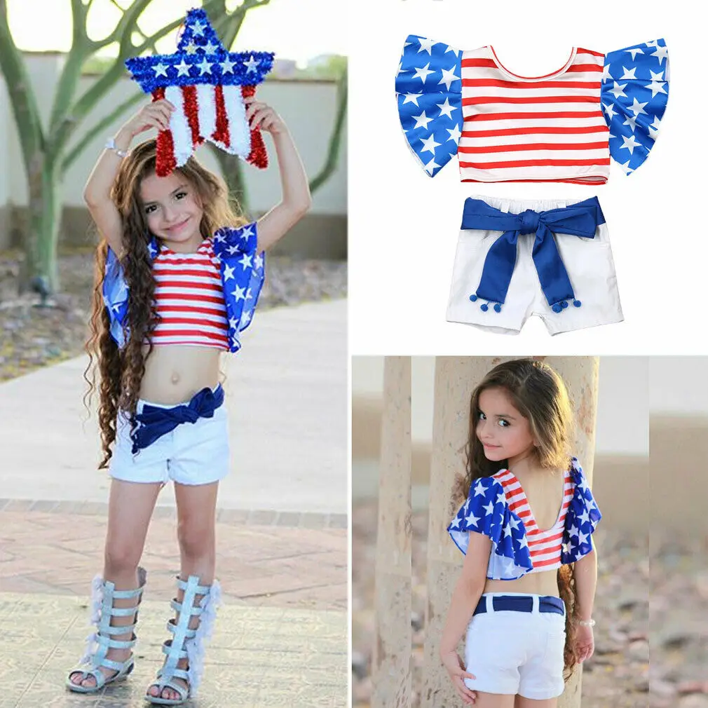 Best Offer for Infant Baby Girl July 4th Independence Day Star Striped Ruffle Sleeve Top+Jeans Pants Holiday Cloth